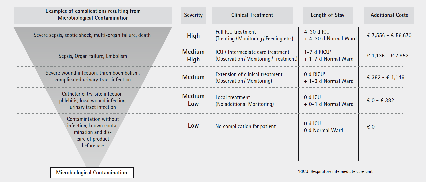 Rys. 14: Szacunkowa ilustracja możliwych kosztów dodatkowych jako konsekwencji komplikacji spowodowanych zanieczyszczeniem mikrobiologicznym. Poziomy ciężkości podano w celu ułatwienia przypisania każdego typu komplikacji to kalkulacji kosztowej 35 ,36 ,37 .